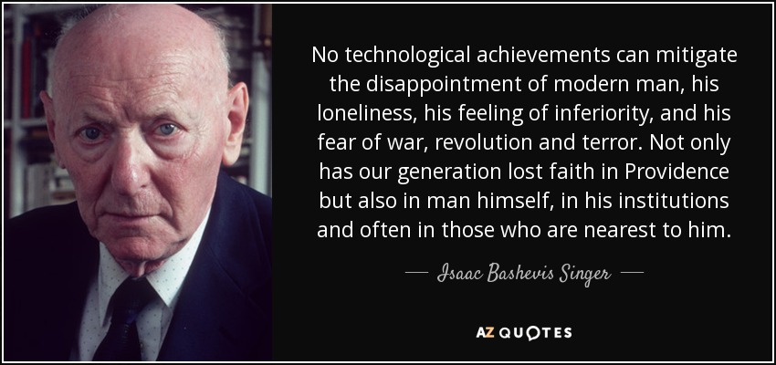 No technological achievements can mitigate the disappointment of modern man, his loneliness, his feeling of inferiority, and his fear of war, revolution and terror. Not only has our generation lost faith in Providence but also in man himself, in his institutions and often in those who are nearest to him.