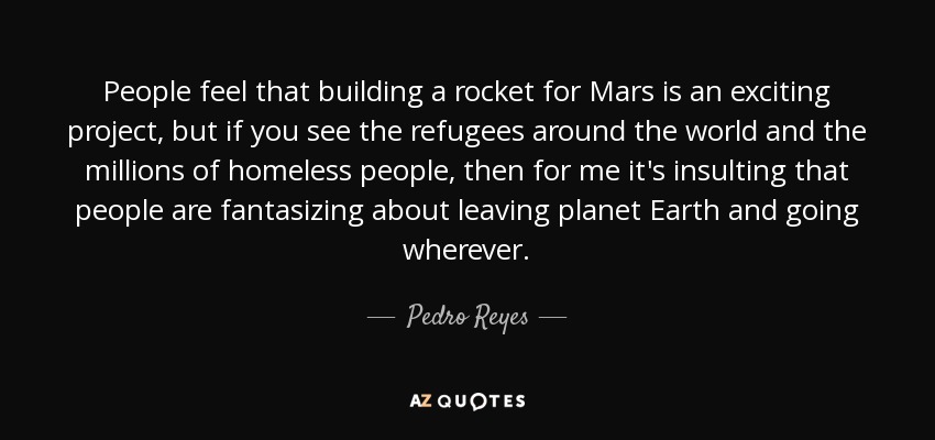 People feel that building a rocket for Mars is an exciting project, but if you see the refugees around the world and the millions of homeless people, then for me it's insulting that people are fantasizing about leaving planet Earth and going wherever.