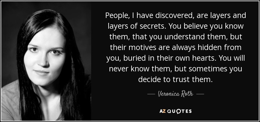 People, I have discovered, are layers and layers of secrets. You believe you know them, that you understand them, but their motives are always hidden from you, buried in their own hearts. You will never know them, but sometimes you decide to trust them.