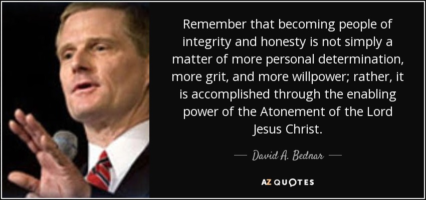 Remember that becoming people of integrity and honesty is not simply a matter of more personal determination, more grit, and more willpower; rather, it is accomplished through the enabling power of the Atonement of the Lord Jesus Christ.