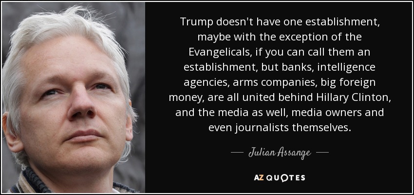Trump doesn't have one establishment, maybe with the exception of the Evangelicals, if you can call them an establishment, but banks, intelligence agencies, arms companies, big foreign money, are all united behind Hillary Clinton, and the media as well, media owners and even journalists themselves.