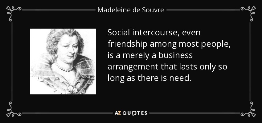 Social intercourse, even friendship among most people, is a merely a business arrangement that lasts only so long as there is need.