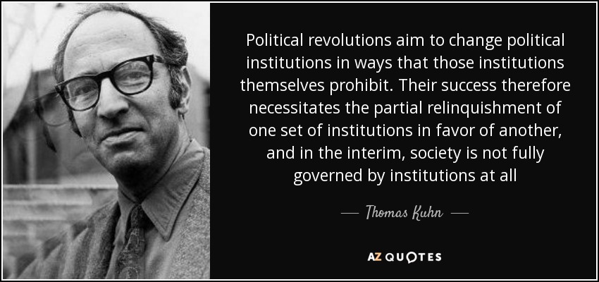Political revolutions aim to change political institutions in ways that those institutions themselves prohibit. Their success therefore necessitates the partial relinquishment of one set of institutions in favor of another, and in the interim, society is not fully governed by institutions at all