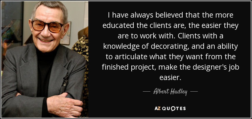 I have always believed that the more educated the clients are, the easier they are to work with. Clients with a knowledge of decorating, and an ability to articulate what they want from the finished project, make the designer's job easier.