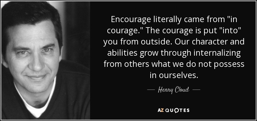 Encourage literally came from "in courage." The courage is put "into" you from outside. Our character and abilities grow through internalizing from others what we do not possess in ourselves.