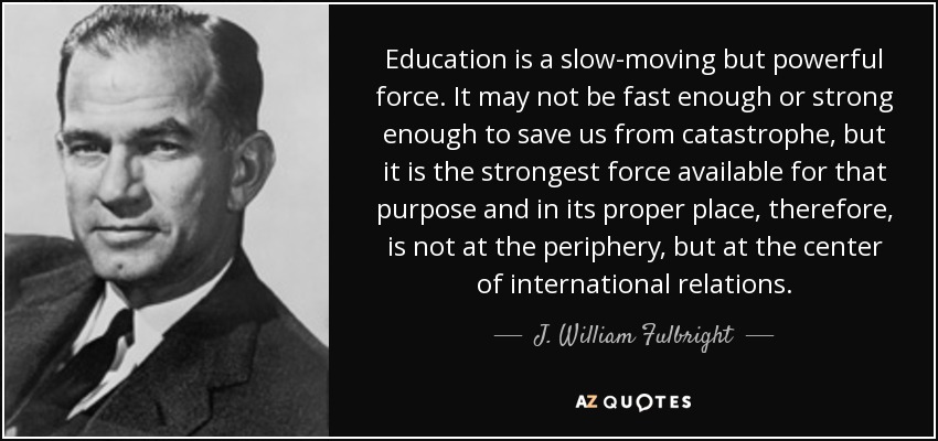 Education is a slow-moving but powerful force. It may not be fast enough or strong enough to save us from catastrophe, but it is the strongest force available for that purpose and in its proper place, therefore, is not at the periphery, but at the center of international relations.