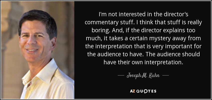 I'm not interested in the director's commentary stuff. I think that stuff is really boring. And, if the director explains too much, it takes a certain mystery away from the interpretation that is very important for the audience to have. The audience should have their own interpretation.
