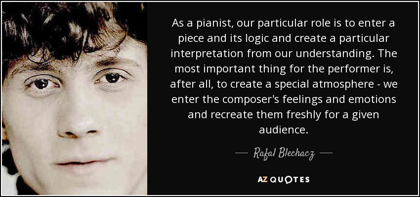 As a pianist, our particular role is to enter a piece and its logic and create a particular interpretation from our understanding. The most important thing for the performer is, after all, to create a special atmosphere - we enter the composer's feelings and emotions and recreate them freshly for a given audience.