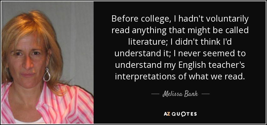 Before college, I hadn't voluntarily read anything that might be called literature; I didn't think I'd understand it; I never seemed to understand my English teacher's interpretations of what we read.