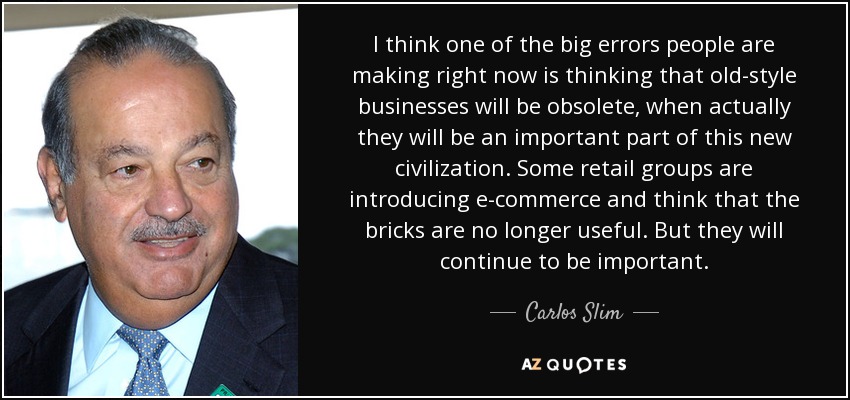 I think one of the big errors people are making right now is thinking that old-style businesses will be obsolete, when actually they will be an important part of this new civilization. Some retail groups are introducing e-commerce and think that the bricks are no longer useful. But they will continue to be important.