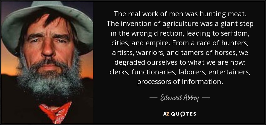 The real work of men was hunting meat. The invention of agriculture was a giant step in the wrong direction, leading to serfdom, cities, and empire. From a race of hunters, artists, warriors, and tamers of horses, we degraded ourselves to what we are now: clerks, functionaries, laborers, entertainers, processors of information.