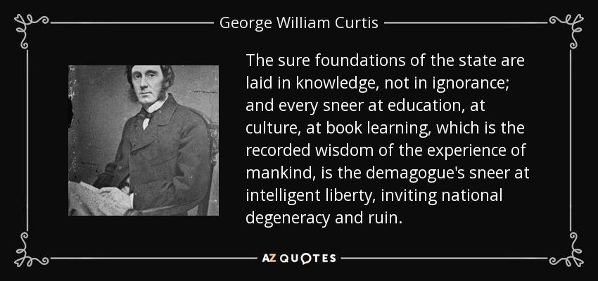 The sure foundations of the state are laid in knowledge, not in ignorance; and every sneer at education, at culture, at book learning, which is the recorded wisdom of the experience of mankind, is the demagogue's sneer at intelligent liberty, inviting national degeneracy and ruin.