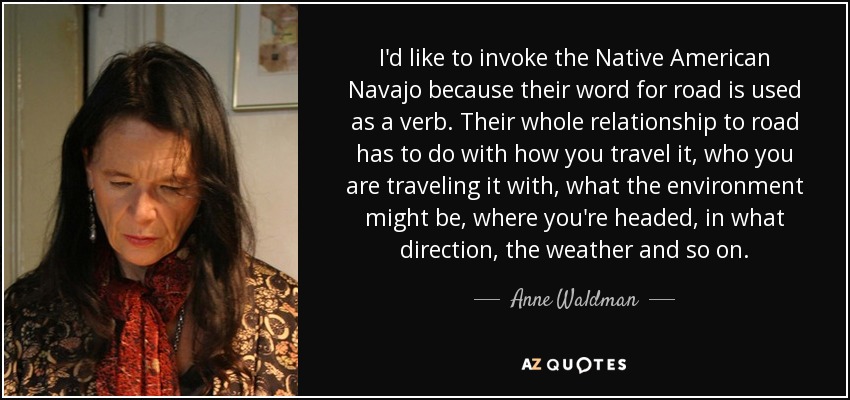 I'd like to invoke the Native American Navajo because their word for road is used as a verb. Their whole relationship to road has to do with how you travel it, who you are traveling it with, what the environment might be, where you're headed, in what direction, the weather and so on.