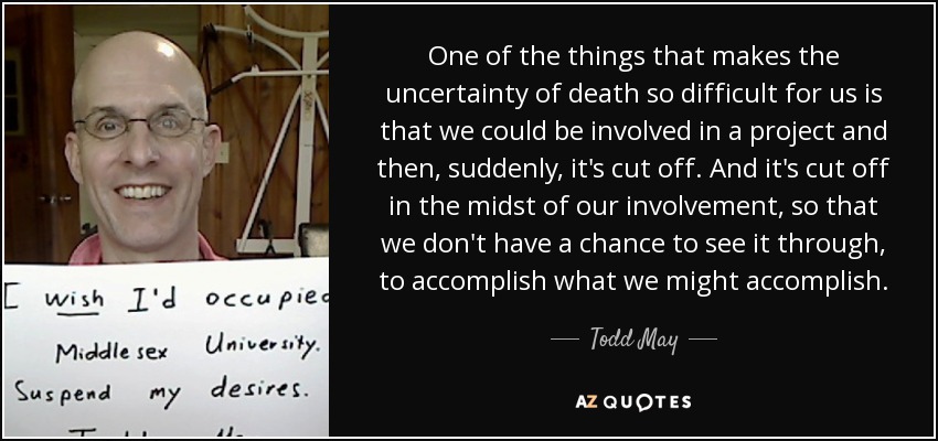 One of the things that makes the uncertainty of death so difficult for us is that we could be involved in a project and then, suddenly, it's cut off. And it's cut off in the midst of our involvement, so that we don't have a chance to see it through, to accomplish what we might accomplish.
