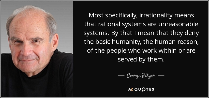 Most specifically, irrationality means that rational systems are unreasonable systems. By that I mean that they deny the basic humanity, the human reason, of the people who work within or are served by them.