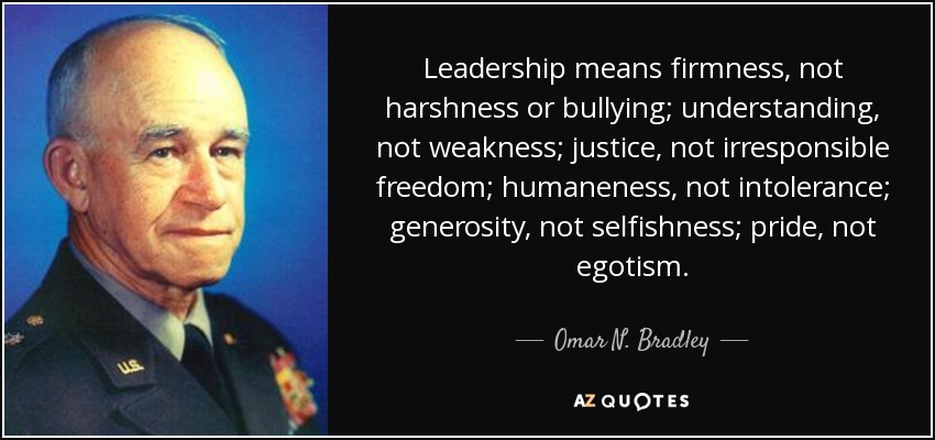Leadership means firmness, not harshness or bullying; understanding, not weakness; justice, not irresponsible freedom; humaneness, not intolerance; generosity, not selfishness; pride, not egotism.