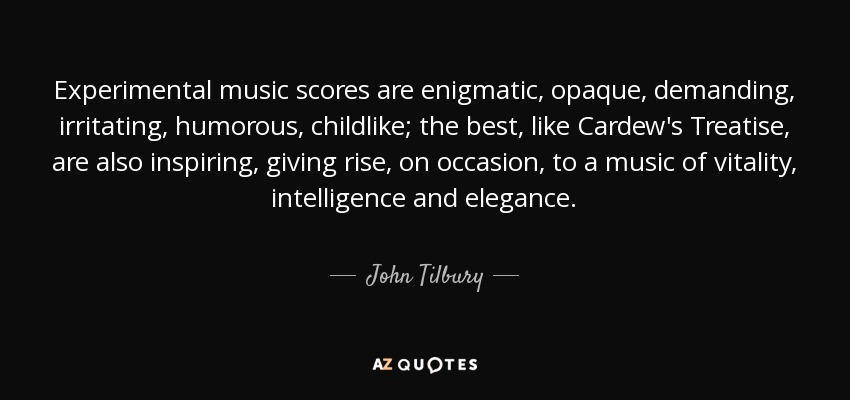 Experimental music scores are enigmatic, opaque, demanding, irritating, humorous, childlike; the best, like Cardew's Treatise, are also inspiring, giving rise, on occasion, to a music of vitality, intelligence and elegance.
