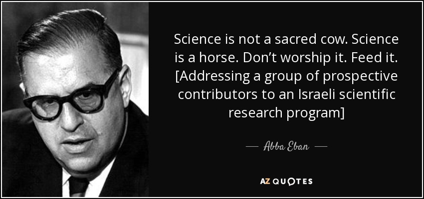 Science is not a sacred cow. Science is a horse. Don’t worship it. Feed it. [Addressing a group of prospective contributors to an Israeli scientific research program]