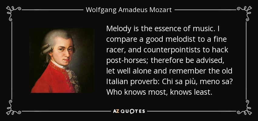 Melody is the essence of music. I compare a good melodist to a fine racer, and counterpointists to hack post-horses; therefore be advised, let well alone and remember the old Italian proverb: Chi sa più, meno sa Who knows most, knows least.