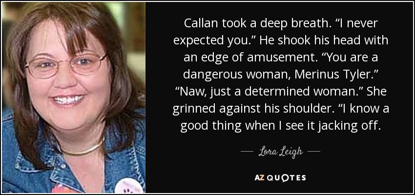 Callan took a deep breath. “I never expected you.” He shook his head with an edge of amusement. “You are a dangerous woman, Merinus Tyler.” “Naw, just a determined woman.” She grinned against his shoulder. “I know a good thing when I see it jacking off.