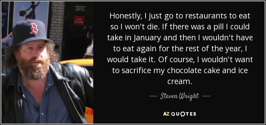 Honestly, I just go to restaurants to eat so I won't die. If there was a pill I could take in January and then I wouldn't have to eat again for the rest of the year, I would take it. Of course, I wouldn't want to sacrifice my chocolate cake and ice cream.