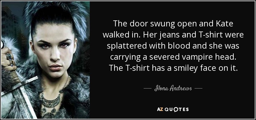 The door swung open and Kate walked in. Her jeans and T-shirt were splattered with blood and she was carrying a severed vampire head. The T-shirt has a smiley face on it.