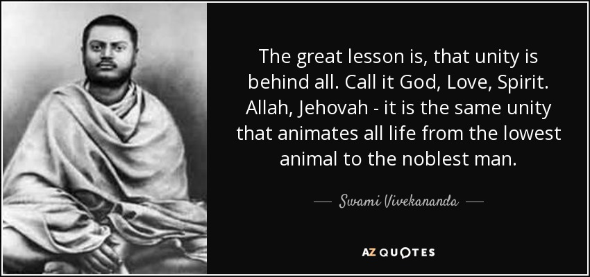 The great lesson is, that unity is behind all. Call it God, Love, Spirit. Allah, Jehovah - it is the same unity that animates all life from the lowest animal to the noblest man.