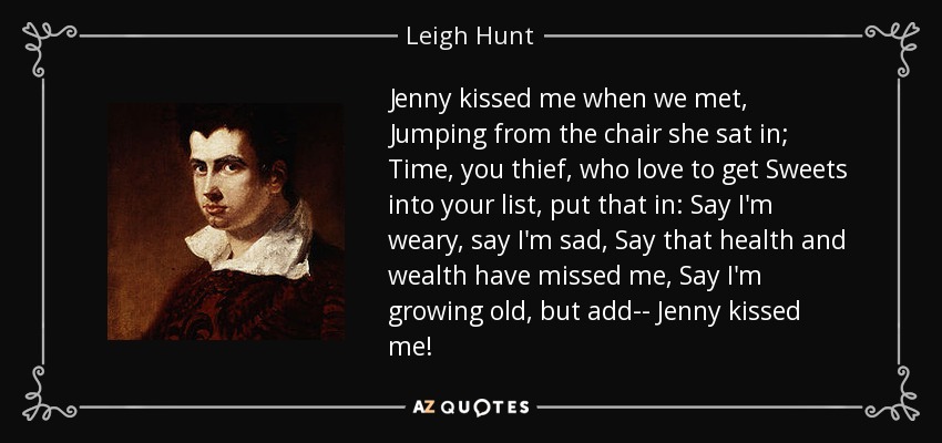 Jenny kissed me when we met, Jumping from the chair she sat in; Time, you thief, who love to get Sweets into your list, put that in: Say I'm weary, say I'm sad, Say that health and wealth have missed me, Say I'm growing old, but add-- Jenny kissed me!