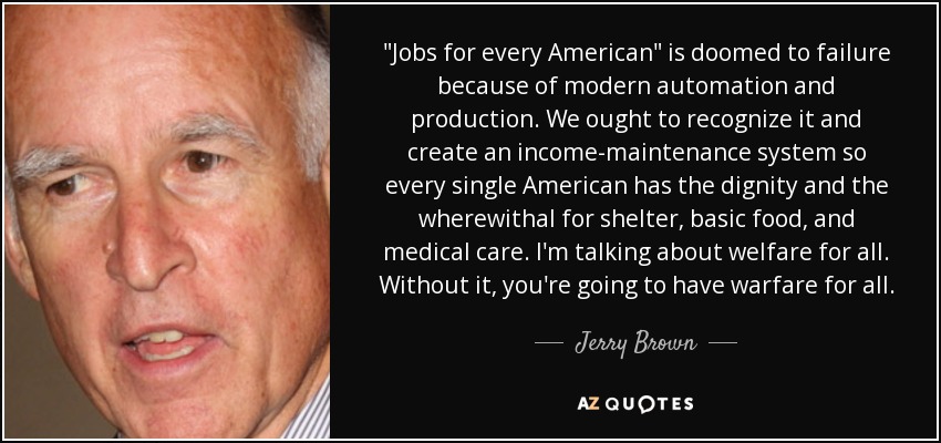"Jobs for every American" is doomed to failure because of modern automation and production. We ought to recognize it and create an income-maintenance system so every single American has the dignity and the wherewithal for shelter, basic food, and medical care. I'm talking about welfare for all. Without it, you're going to have warfare for all.