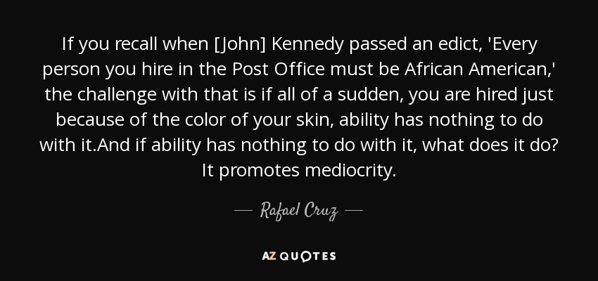 If you recall when [John] Kennedy passed an edict, 'Every person you hire in the Post Office must be African American,' the challenge with that is if all of a sudden, you are hired just because of the color of your skin, ability has nothing to do with it.And if ability has nothing to do with it, what does it do? It promotes mediocrity.