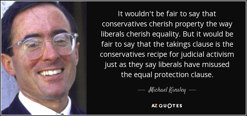 It wouldn't be fair to say that conservatives cherish property the way liberals cherish equality. But it would be fair to say that the takings clause is the conservatives recipe for judicial activism just as they say liberals have misused the equal protection clause.