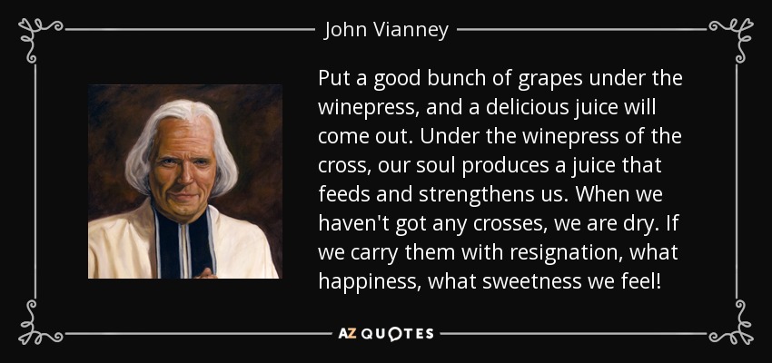 Put a good bunch of grapes under the winepress, and a delicious juice will come out. Under the winepress of the cross, our soul produces a juice that feeds and strengthens us. When we haven't got any crosses, we are dry. If we carry them with resignation, what happiness, what sweetness we feel!