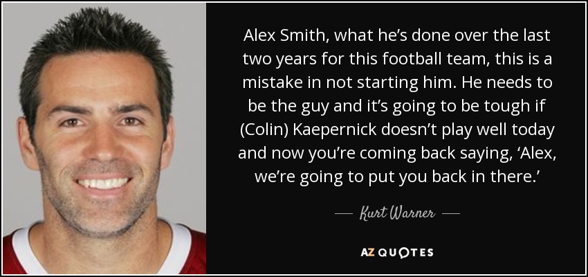 Alex Smith, what he’s done over the last two years for this football team, this is a mistake in not starting him. He needs to be the guy and it’s going to be tough if (Colin) Kaepernick doesn’t play well today and now you’re coming back saying, ‘Alex, we’re going to put you back in there.’