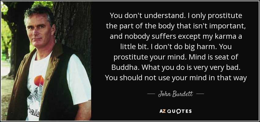 You don't understand. I only prostitute the part of the body that isn't important, and nobody suffers except my karma a little bit. I don't do big harm. You prostitute your mind. Mind is seat of Buddha. What you do is very very bad. You should not use your mind in that way