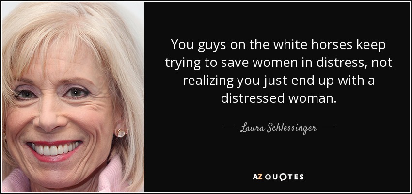 You guys on the white horses keep trying to save women in distress, not realizing you just end up with a distressed woman.