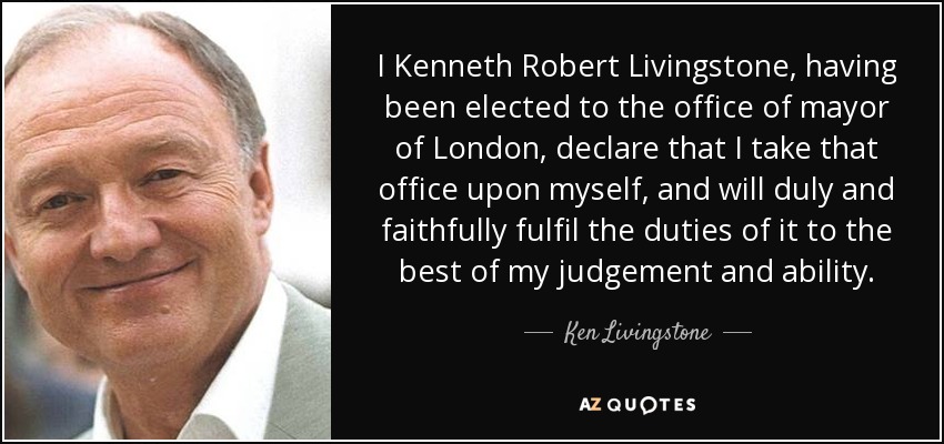 I Kenneth Robert Livingstone, having been elected to the office of mayor of London, declare that I take that office upon myself, and will duly and faithfully fulfil the duties of it to the best of my judgement and ability.