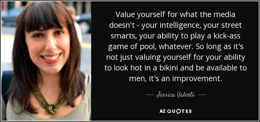 Value yourself for what the media doesn't - your intelligence, your street smarts, your ability to play a kick-ass game of pool, whatever. So long as it's not just valuing yourself for your ability to look hot in a bikini and be available to men, it's an improvement.