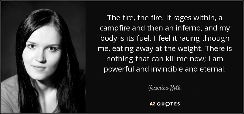 The fire, the fire. It rages within, a campfire and then an inferno, and my body is its fuel. I feel it racing through me, eating away at the weight. There is nothing that can kill me now; I am powerful and invincible and eternal.