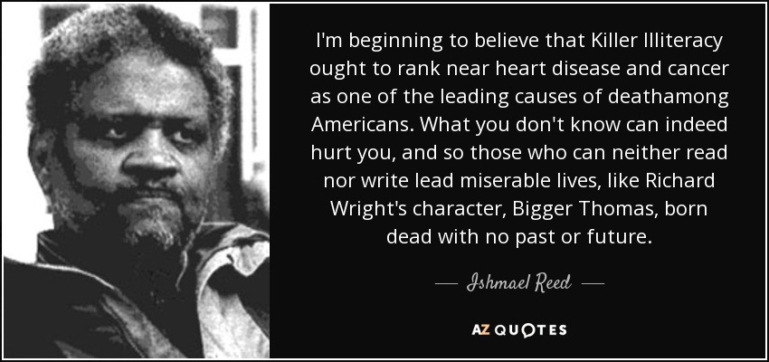 I'm beginning to believe that Killer Illiteracy ought to rank near heart disease and cancer as one of the leading causes of deathamong Americans. What you don't know can indeed hurt you, and so those who can neither read nor write lead miserable lives, like Richard Wright's character, Bigger Thomas, born dead with no past or future.