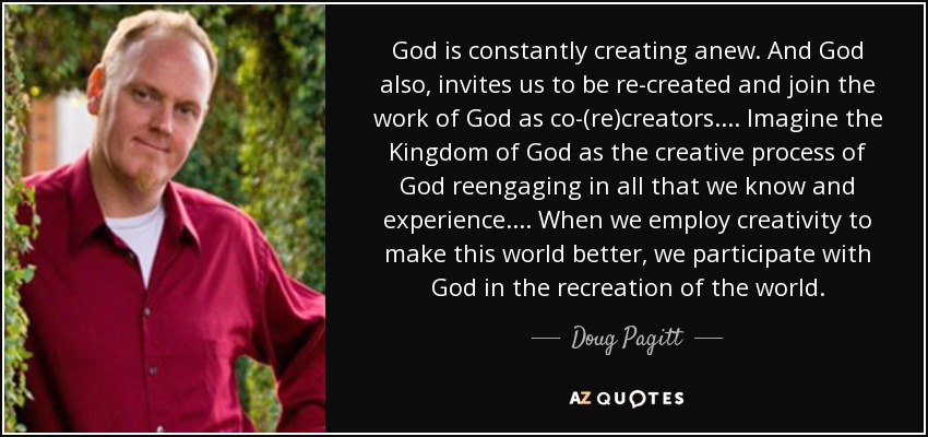 God is constantly creating anew. And God also, invites us to be re-created and join the work of God as co-(re)creators. . . . Imagine the Kingdom of God as the creative process of God reengaging in all that we know and experience. . . . When we employ creativity to make this world better, we participate with God in the recreation of the world.