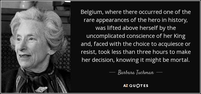 Belgium, where there occurred one of the rare appearances of the hero in history, was lifted above herself by the uncomplicated conscience of her King and, faced with the choice to acquiesce or resist, took less than three hours to make her decision, knowing it might be mortal.