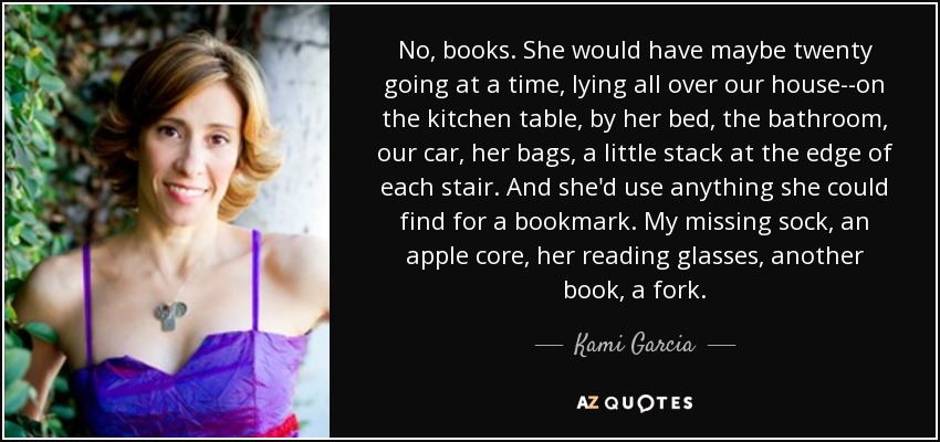 No, books. She would have maybe twenty going at a time, lying all over our house--on the kitchen table, by her bed, the bathroom, our car, her bags, a little stack at the edge of each stair. And she'd use anything she could find for a bookmark. My missing sock, an apple core, her reading glasses, another book, a fork.