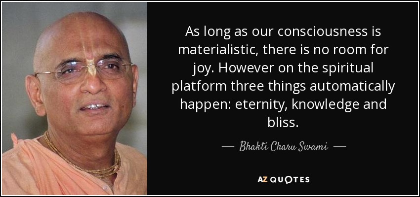 As long as our consciousness is materialistic, there is no room for joy. However on the spiritual platform three things automatically happen: eternity, knowledge and bliss.