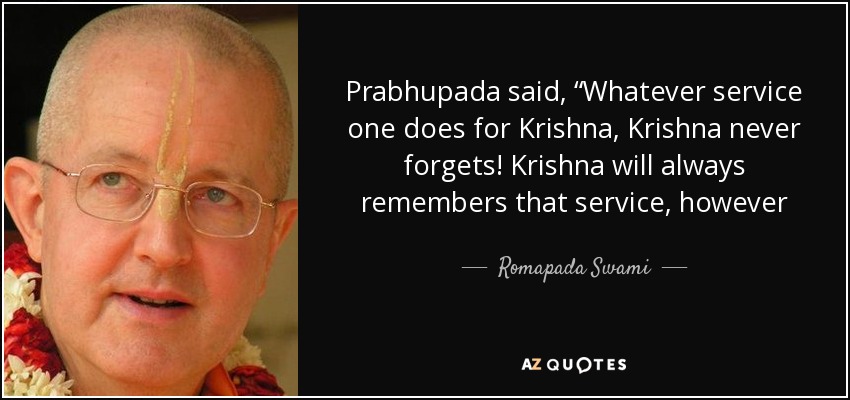 Prabhupada said, “Whatever service one does for Krishna, Krishna never forgets! Krishna will always remembers that service, however insignificant. Even if he comes to the temple and he turns one screw for Krishna, Krishna will never forget.”