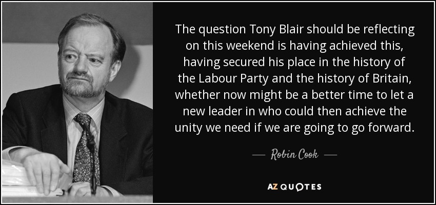 The question Tony Blair should be reflecting on this weekend is having achieved this, having secured his place in the history of the Labour Party and the history of Britain, whether now might be a better time to let a new leader in who could then achieve the unity we need if we are going to go forward.