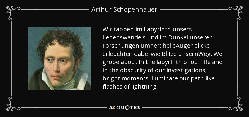 Wir tappen im Labyrinth unsers Lebenswandels und im Dunkel unserer Forschungen umher: helleAugenblicke erleuchten dabei wie Blitze unsernWeg. We grope about in the labyrinth of our life and in the obscurity of our investigations; bright moments illuminate our path like flashes of lightning.