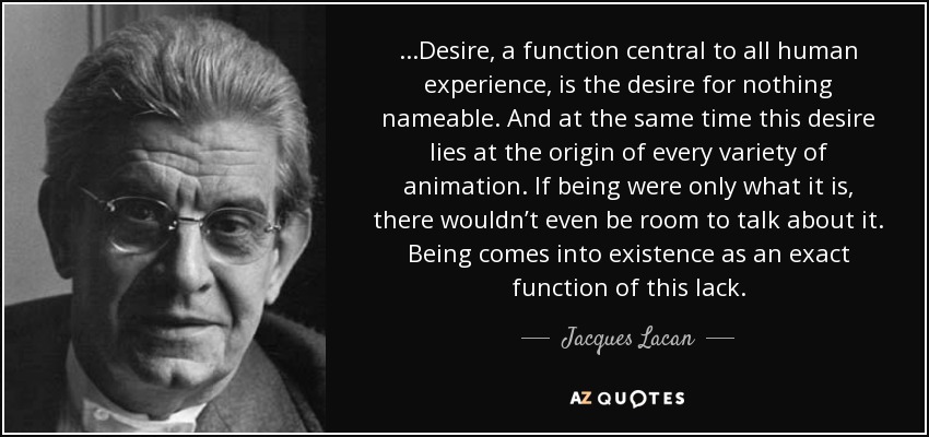 ...Desire, a function central to all human experience, is the desire for nothing nameable. And at the same time this desire lies at the origin of every variety of animation. If being were only what it is, there wouldn’t even be room to talk about it. Being comes into existence as an exact function of this lack.