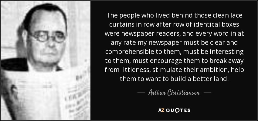 The people who lived behind those clean lace curtains in row after row of identical boxes were newspaper readers, and every word in at any rate my newspaper must be clear and comprehensible to them, must be interesting to them, must encourage them to break away from littleness, stimulate their ambition, help them to want to build a better land.
