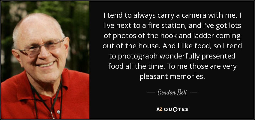I tend to always carry a camera with me. I live next to a fire station, and I've got lots of photos of the hook and ladder coming out of the house. And I like food, so I tend to photograph wonderfully presented food all the time. To me those are very pleasant memories.