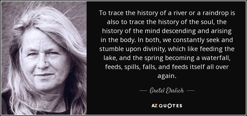 To trace the history of a river or a raindrop is also to trace the history of the soul, the history of the mind descending and arising in the body. In both, we constantly seek and stumble upon divinity, which like feeding the lake, and the spring becoming a waterfall, feeds, spills, falls, and feeds itself all over again.